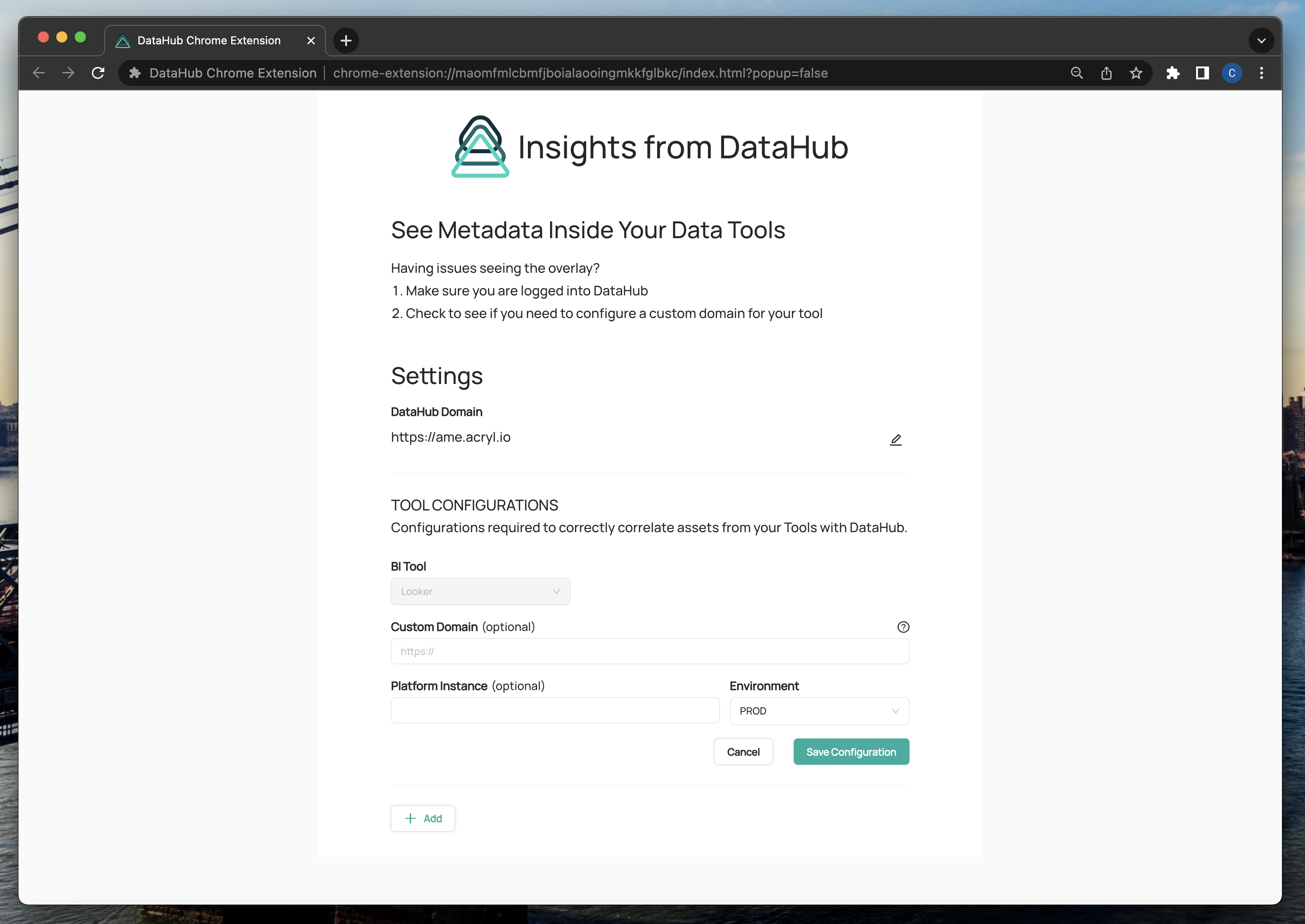 Some organizations have custom SaaS domains for Looker and some Acryl DataHub deployments utilize Platform Instances and set custom Environments when creating DataHub assets. If any of these situations applies to you, please follow the next few steps to finish configuring your extension.