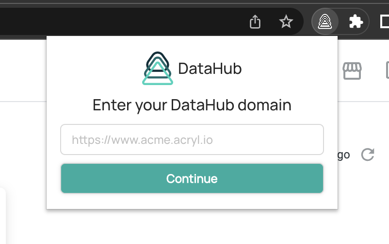 - Fill in your DataHub domain and click "Continue" in the extension popup that appears.