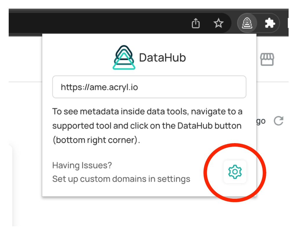 - Click on the extension button and select your DataHub extension to open the popup again. Now click the settings icon in order to open the configurations page.