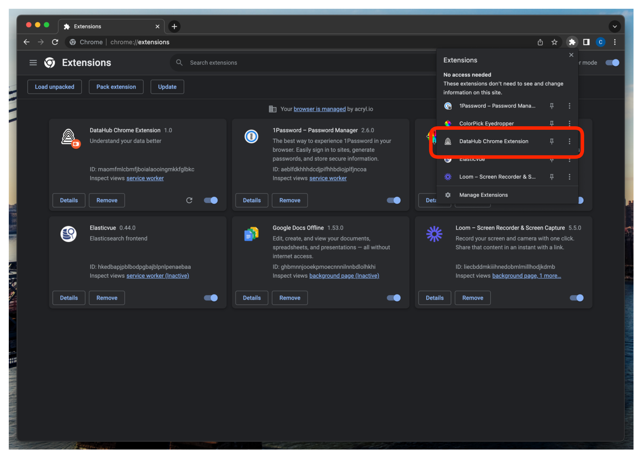 - Click the extension button on the right of your browser's address bar to view all of your installed extensions. Click on the newly installed DataHub extension.